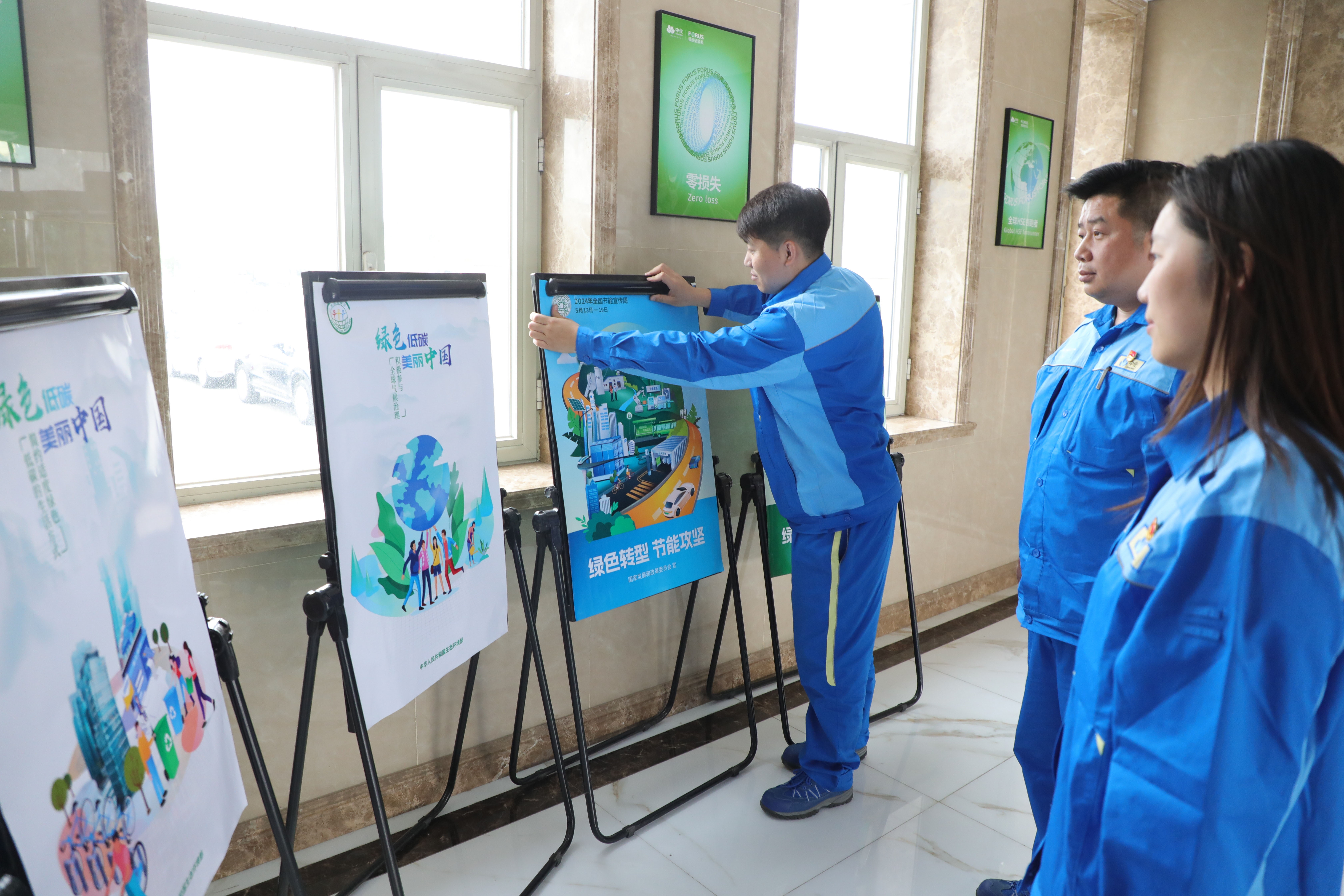 圖為沈陽化工員工正在張貼節(jié)能宣傳周海報?