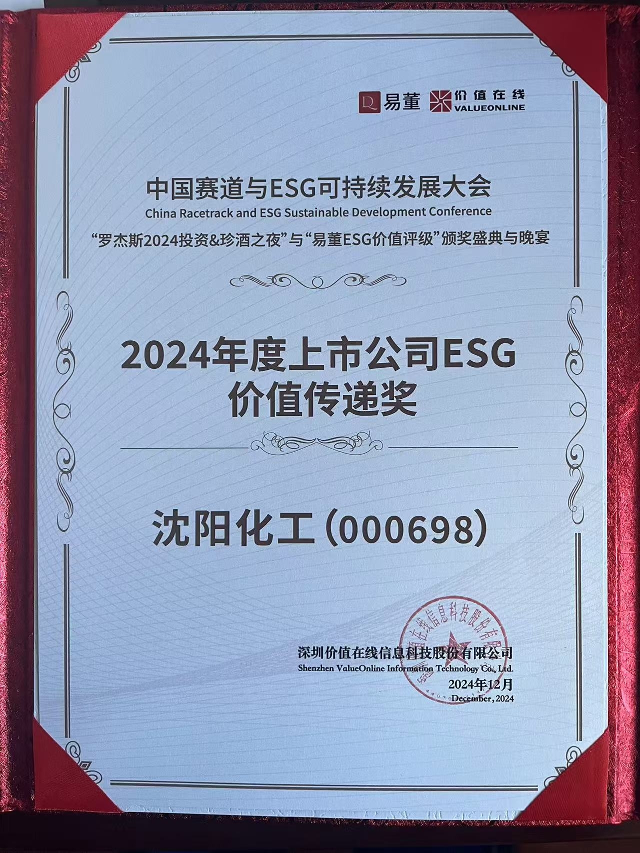 12月7日—8日,由價值在線和亞洲商務(wù)大學(xué)堂主辦,以“投資光明,共創(chuàng)未來”為主題的“中國賽道與ESG可持續(xù)發(fā)展大會”在深圳市光明區(qū)召開。數(shù)百家上市企業(yè)代表云集,聚焦綠色創(chuàng)新,共同探索經(jīng)濟高質(zhì)量發(fā)展路徑。大會發(fā)布2024年度易董ESG+8“價值100榜單”,沈陽化工股份有限公司(以下簡稱“沈陽化工”)憑借其在環(huán)境、社會及公司治理(ESG)領(lǐng)域的卓越表現(xiàn),成功榮獲這一殊榮。此前,沈陽化工已獲得“國新杯·ESG金牛獎”,此次獲獎為沈陽化工于本年度在ESG工作領(lǐng)域收獲的第二大獎項。